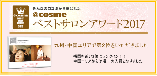 2017年にたくさんある治療院の中で中国九州エリアで2番、広島エリアでは1番に選ばれました。