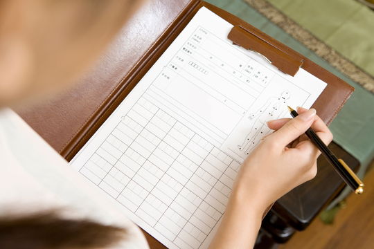 初めての方には、受付でバインダーをお渡しします。お手数ですが、症状やお悩みなどについての簡単なアンケートへのご記入をお願いいたします。